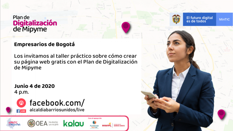 Para todos los emprendedores, comerciantes y empresarios de @Bogotá: los invitamos al taller práctico sobre cómo crear su página web con el Plan de Digitalización de Mipyme. Una Alianza del Ministerio de las TIC, la OEA, Kolau, Fundación Genval y Alcaldía Local de Barrios Unidos