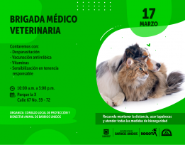 Te invitamos a la Brigada Veterinaria que tendremos el próximo jueves 17 de marzo, de 10:00 a.m. a 5::00 p.m. en el parque La X (Calle 67 # 59 - 72) Tendremos servicios de: Desparasitación, vacunación antirrábica, vitaminas y sensibilización en tenencia responsable. Recuerda llevar copia de la cédula y copia de recibo de servicio público de la localidad. ¡Te esperamos! Recuerda cumplir con todos los protocolos de bioseguridad Organiza Consejo Local de Protección y Bienestar Animal. #BarriosUnidosSomosEjemplo