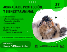 ¡Nuestra localidad vela por la defensa y calidad de vida de nuestros animalitos de compañía! Invitamos a la comunidad a la Jornada de Protección y Bienestar Animal Viernes 27 de mayo 9:00 a.m. a 1:00 p.m. CAI 7 de agosto (Carrera 30 con calle 64) Contaremos con: - Atención médico veterinaria - Vacunación antirrábica - Desparasitación Recuerda atender las medidas de bioseguridad ¡Te esperamos! #BarriosUnidosSomosEjemplo